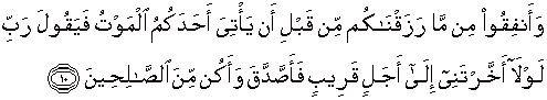 “Dan belanjakanlah (dermakanlah) sebahagian dari rezeki yang Kami berikan kepada kamu sebelum seseorang dari kamu sampai ajal maut kepadanya, (kalau tidak) maka ia (pada saat itu) akan merayu dengan katanya: ” Wahai Tuhanku! Alangkah baiknya kalau Engkau lambatkan kedatangan ajal matiku — ke suatu masa yang sedikit sahaja lagi, supaya aku dapat bersedekah dan dapat pula aku menjadi dari orang-orang yang soleh.”